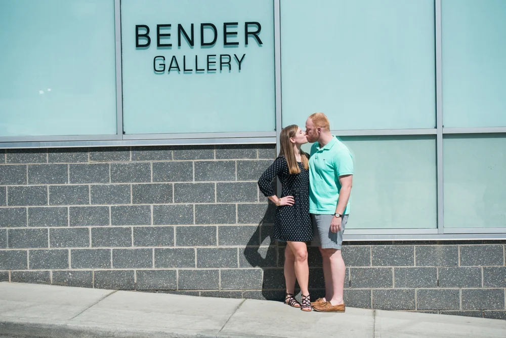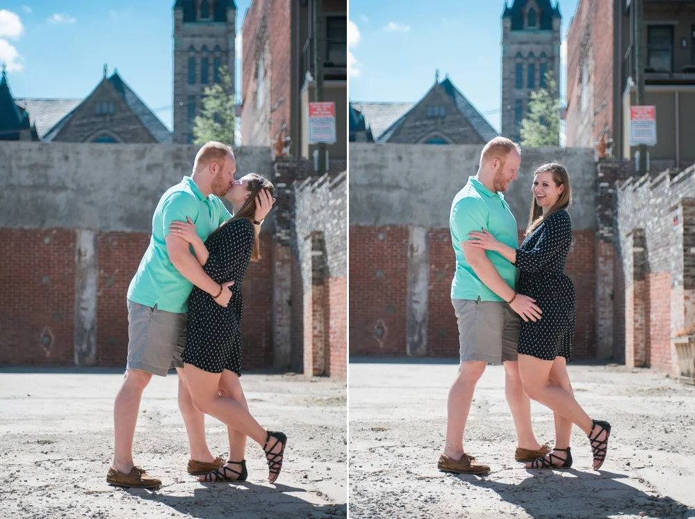 As a part of this "fun and local" themed shoot, I also wanted to include other people since downtown was packed with people. As we were shooting in this really cool abandoned lot with the church peaking out behind, a family happened to walk by in a line right at the perfect time to frame Ashli and Dustin's kissing. With the sun highlighting the couple and the boys drawing your eye through the scene, I couldn't be happier with this storytelling shot.